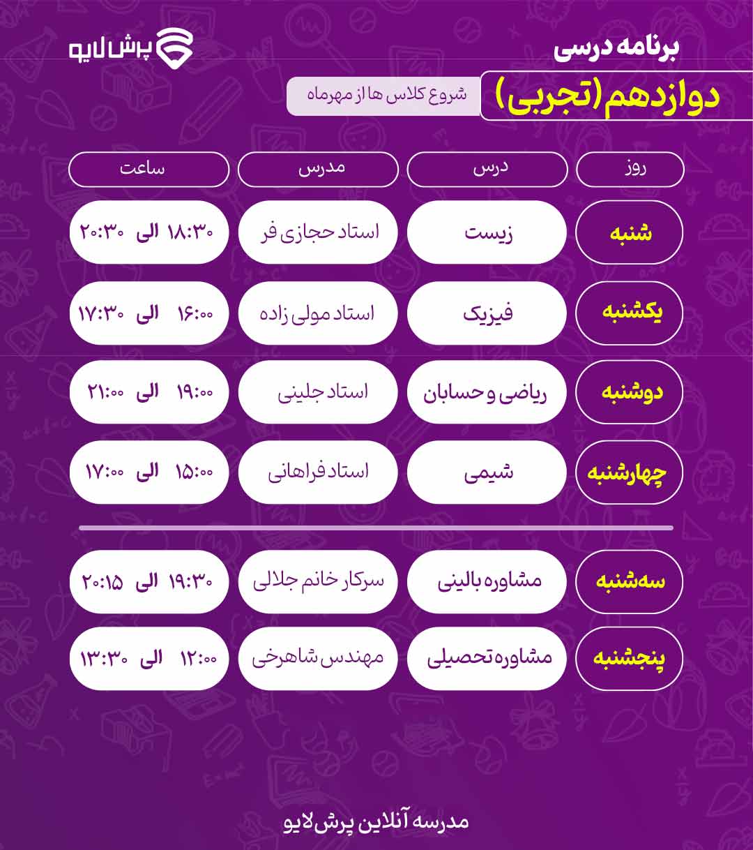 باید درنظر بگیرین تو رشته تجربی خوندن هر درس روش و تکنیک خاص خودش رو داره. ما تو کلاسهای کنکور تجربی پرش لایو تمام این تکنیکها و روشهارو به شما آموزش میدیم. تو این کلاسها دروس زیست، فیزیک، شیمی و ریاضی رو به شما آموزش میدیم. ما با هدف ارتقای رتبه کنکور شما امکاناتی مثل دسترسی به جزوهها و نمونه سوالات استاد، دیدن چندین باره کلاسها بصورت آفلاین و پرسش و پاسخ رو در اختیارتون گذاشتیم تا فضای کلاس تعاملیتر و پویاتر از همیشه باشه.
