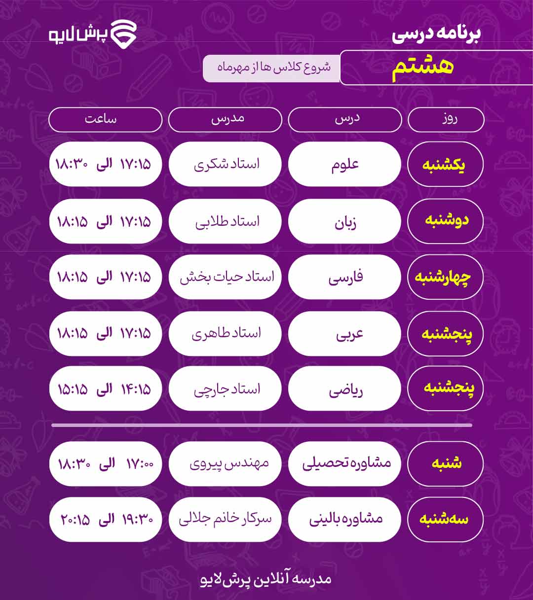 عربی: عربی هشتم بخاطر سختتر شدن قواعد به مرور و تمرین بیشتر نیاز داره. قواعد عربی بهم پیوسته هستن؛ آموزش باید شکل روان باشه که بتونه ملکه ذهن دانشآموز بشه. پایه قوی تو این درس باعث میشه در مقاطع بالاتر دانشآموز با چالشی روبهرو نشه.