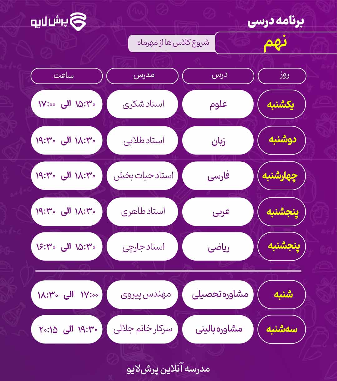 پایه نهم چالشهای سختی داره. چالشهایی که باید فکری به حالشون کرد، تا با موفقیت سپری بشن. امتحان نهایی، انتخاب رشته و در آخر آزمون ورودی مدارس برتر و تیزهوشان یکسری از این چالشهاست. تاثیر نمرات پایه نهم در انتخاب رشته و در نهایت در کنکور زیاده. دانشآموز باید خیلی به نمرههای این مقطع توجه کنه؛ چون نمرات سه پایه متوسطه اول در انتخاب رشته تاثیر گذاره؛ و اگه نمرات دو پایه قبلی خوب نباشن این تنها فرصت دانشآموز برای جبرانه. درسته در مرحله اول وقتی به این مسائل فکر میکنیم بنظرمون کار سختی به نظر میاد؛ اما با برنامهریزی، کمک گرفتن و پشتکار دانشآموز این مسائل قابل حل هستن. ما تو کلاس آنلاین پایه نهم سعی کردیم دورهای رو طراحی کنیم که همراه خوبی برای شما باشه و با موفقیت این مراحل رو پشت سر بذارین.